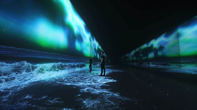 本项目的灵感来自于自然界的无限复杂性,特别是水的视觉和音质的多样性。这个项目在室内建筑空间中强力呈现海浪的音频、并与海浪的视频同步,成功地实现了当代艺术与技术的完美结合,激发了观众的潜意识,唤起了我们对海的联想和感官依赖。星光海滩的美学品质,通过重新诠释水的物理性质,超越了单纯的视觉奇观或感性元素,有效地改变了观众对空间和身体的感知。