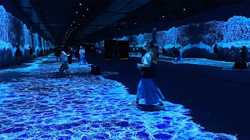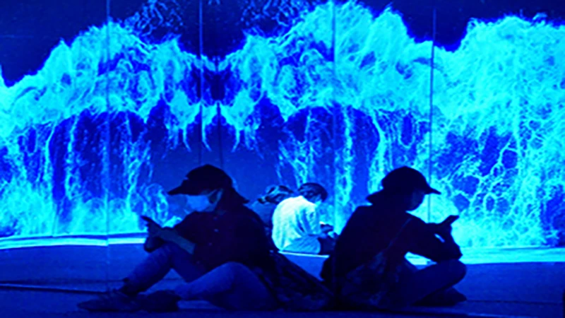 伴随着冲击波的声音,高清晰度的波浪在6米高的墙壁上下奔腾,以独特的视觉节奏点缀着漆黑的环境。