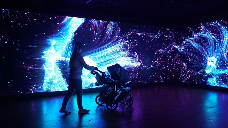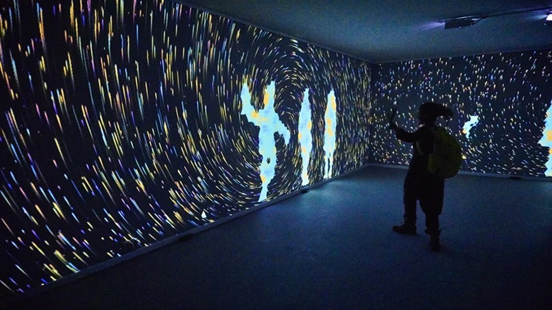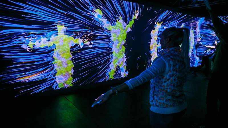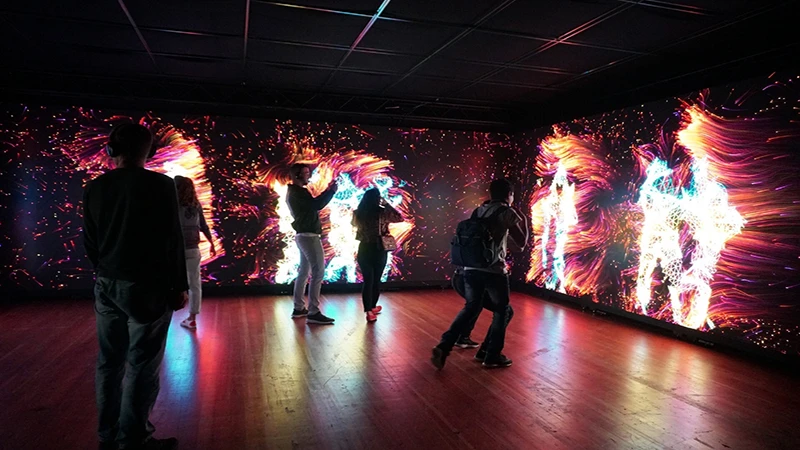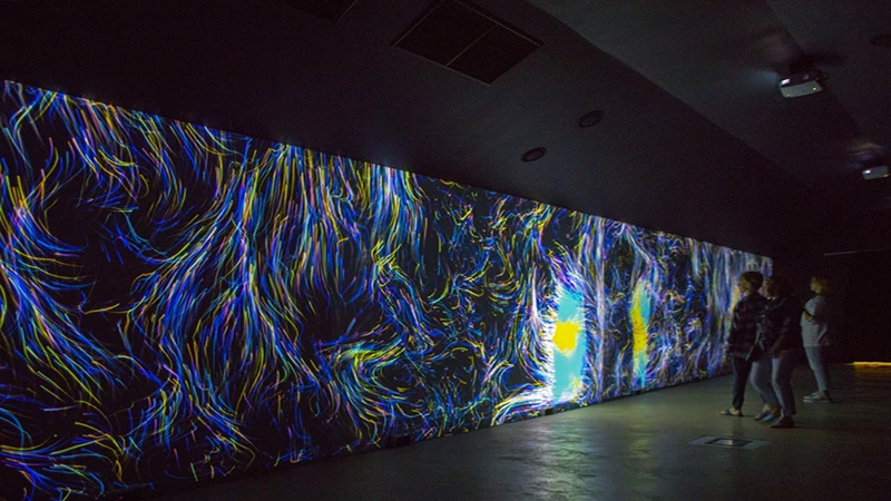 这个实验室由视听艺术家组成,他们探索使用视频、声音和灯光、跟踪技术来产生互动数字影像,借助数学算法对系统感知的图像和声音进行处理,来生成艺术化图形。这种方式让观众沉浸在数字空间中,互动的方式打破了感官感知的定型观念,沉浸效应使的观众更趋于感性,并激发内心的自发情绪。