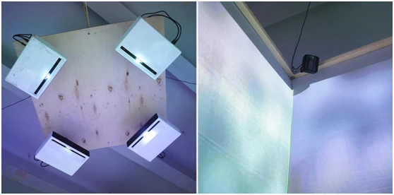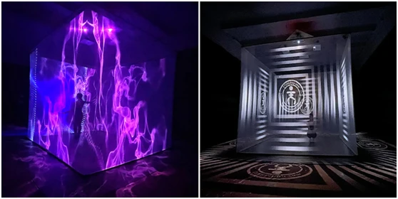 投影立方体由一个坚固的框架制成,框架上覆盖着特殊的织物——一个不可见的透明3D屏幕。四台投影仪和一台功能强大的计算机确保了高质量的投影映射和惊人的3D效果。
