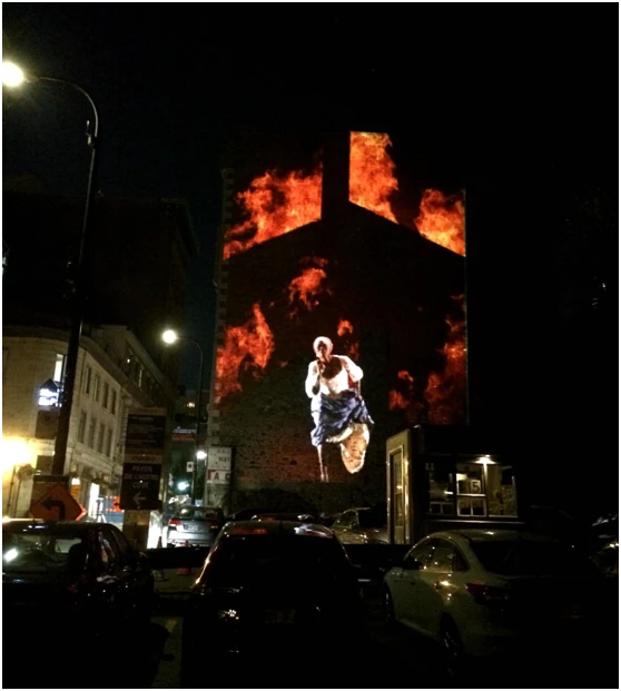 关于1849年焚烧议会的画面可以在尤维尔广场的旧消防站找到。投影使用了建筑上的一扇用墙围起来的窗户,营造出一对忧心忡忡的夫妇向外凝视的影像。你和他们一起看着抗议者聚集在街对面的大楼前,大楼被照亮成议会的样子。