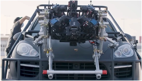所有这些摄像装备被带到拍摄地(森林、赛道、峡谷),安装在起重机或直升机上,绑在船上或过山车上的手臂上,以拍摄需要的场景。