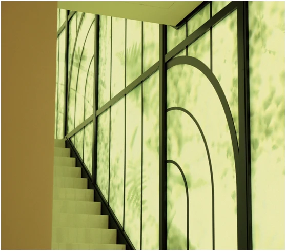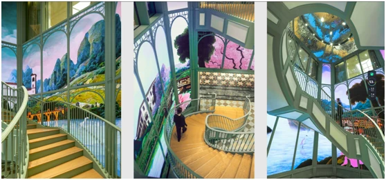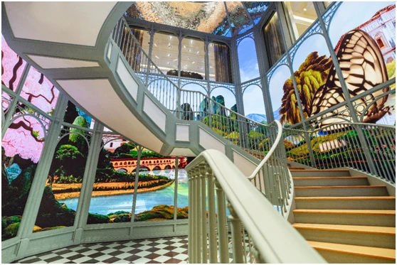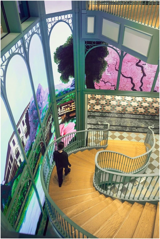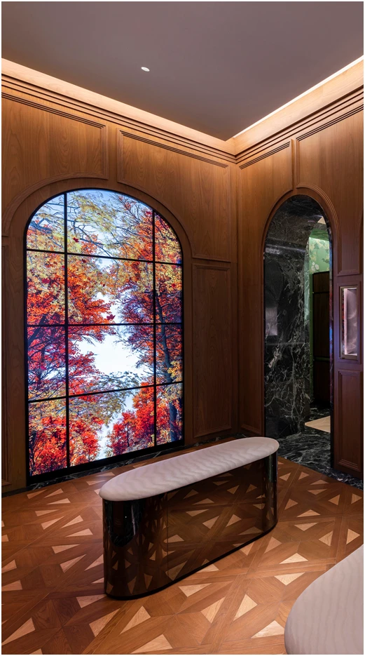 自然的四季更替在商店正面的高而圆的黑色拱门中展开——数字壁画按照自己的昼夜节律运行。白天这些数字壁画的玻璃是透明的,可以看到商店内的活动场景。到了晚上,这些立面被数字影像覆盖。