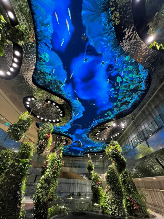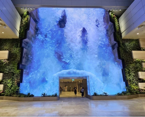 这个迷人的装置坐落在一个垂直的花园中,俯瞰着出发大厅,在那里,水从巨石上倾泻而下,创造了一个令人着迷和印象深刻的奇观。