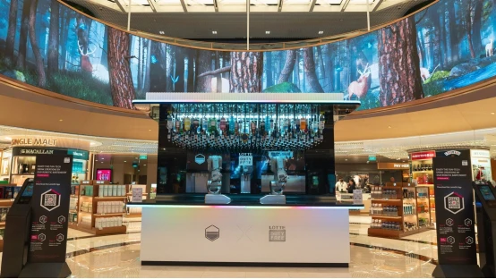 在新的零售和餐饮产品中,乐天免税葡萄酒和烈酒公司横跨两层楼,拥有一个机器人调酒师一个品酒休息室和一个30米长的LED环,让人想起湖面上反射的月亮。上层的李白森林是一个豪华的休息室。在这里,游客还可以使用智能自拍镜与著名K-pop艺术家合影。