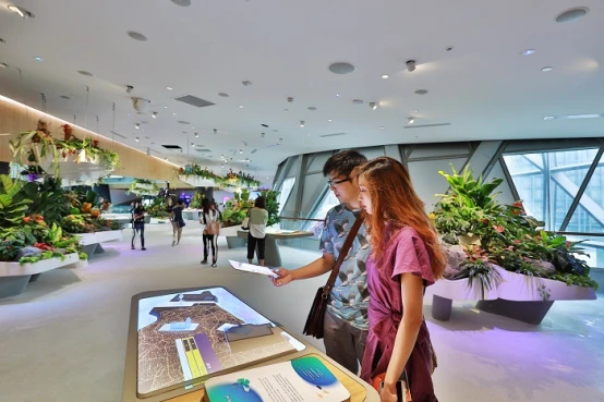 其中的“数字天空”使花园充满活力,它可以实时模拟出新加坡真实的天气。辅以来自100种不同物种的20万株植物的新加坡珍稀动植物作为数字素材,形成了各种水上水下的景观场景。透明地板同样可以模拟出鱼塘和100多种鸟类、昆虫和并伴以自然音效。