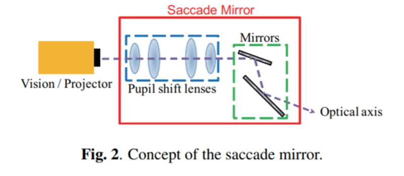 扫视镜最初是作为一个子系统开发的,用于控制视觉传感器在毫秒级的注视方向。也可以控制投影方向,因为视觉传感器和投影仪可以被视为光学等效。扫视镜由用于摇摄和倾斜的两轴检流计反射镜和称为瞳孔移位透镜的透镜组成,如下图所示:
