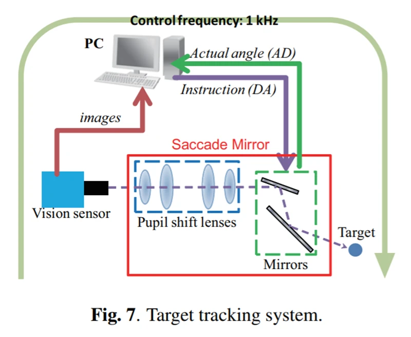 扫视镜根据被跟踪对象的动态来控制投影方向。因此,原理上是利用视觉传感器进行视觉伺服。在该系统中,高速视觉传感器(1000 fps)安装在扫视镜上。传感器捕捉到外部视图并将其传输到PC机,然后由PC机执行机器视觉处理,用于定位运动物体的位置,并每隔1ms根据该位置控制后视镜的角度以补偿跟踪误差,从而实现视觉伺服。